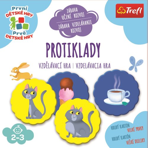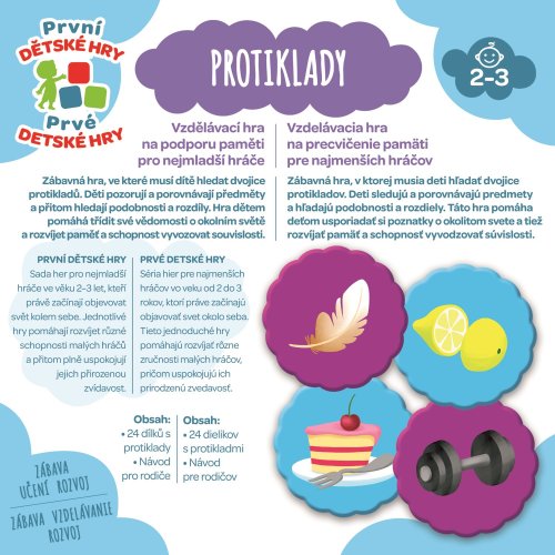 Hra obsahuje: 24 dílků s protiklady a návod pro rodiče. První dětské hry Sada her pro nejmladší hráče ve věku 2-3 let, kteří začínají objevovat svět kolem sebe. Jednotlivé hry pomáhají rozvíjet různé schopnosti malých hráčů a přitom plně uspokojují jejich přirozenou zvídavost.