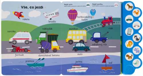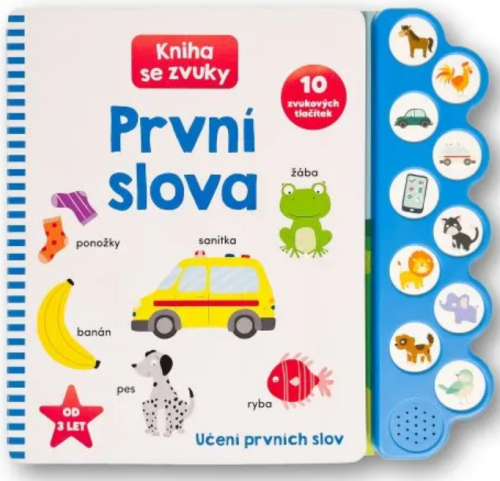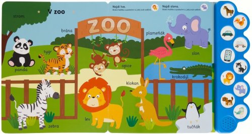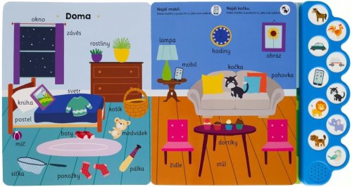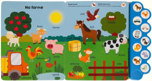 Tato zvuková kniha s deseti tlačítky s různými zvuky představí dětem okolní svět! ***** Ať už jste se svým děťátkem doma, v parku, ve městě nebo třeba v zoo, všude je spoustu věcí a zvířat k pojmenování. Bavte se při učení prvních slov s touto knihou se zvuky. Stiskněte tlačítko na zvukovém panelu vpravo a poslechněte si, jaký zvuk vydává kočka, slon, auto nebo kůň. Jednoduchý úkol na hledání správného obrázku pomůže dětem spojit si obrazové a zvukové vjemy.