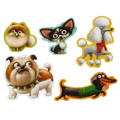 Puzzlika, nová značka puzzlů s moderním kreativním designem, přináší pro malé děti aktivní učení formou zábavné hry. Obrázkové puzzle Psi 5 v 1 obsahuje 27 velkých pevných puzzlů, ze kterých poskládáte 5 samostatných obrázků. Na každém obrázku je vždy vyobrazen roztomilý pejsek. Jednotlivé obrázky mají 4 až 8 dílků. Puzzle je skvělá hra pro malé děti, která u nich rozvíjí logické myšlení, představivost, kreativitu, jemnou motoriku a různé poznávací znalosti. Puzzle jsou vyrobeny z velice pevného vícevrstvého kartonu s lesklým povrchem. Karton byl vyroben z kvalitního, ekologicky pěstovaného dřeva. Puzzle je možné otřít vlhkým hadříkem. Nevhodné pro děti do 2 let. Vyrobeno v Evropě.