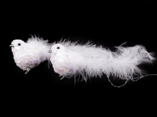 Dekorační ptáček působí něžně a romanticky. Tělo má pokryté jemným plyšem a najdete na něm i odlesky s AB efektem. Zespodu má připevněnou kovovou sponu, díky které můžete ptáčka připevnit například na věnec, větvičku, záclonu či ho naaranžovat do květinových vazeb. [Zajímavě vynikne na vánočním stromečku.]