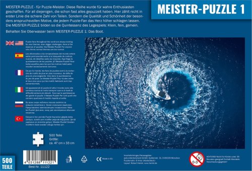 Fanoušci skládání po celém světě neustále vyhlížejí nové puzzle výzvy. Proto byly zrozeny Meister-Puzzle - série obzvláště náročných motivů vytvořená speciálně pro všechny, kdo si myslí, že normální puzzle jsou příliš normální. Meister-Puzzle jsou puzzle pro mistry. Zůstaňte nad vodou s prvním motivem Meister-Puzzle 1: Loď . Rozměr složeného puzzle cca 47 x 33 cm