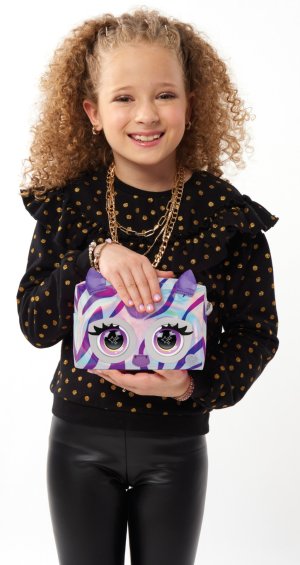 Interaktivní kabelka Zebra má veliké mrkací oči, které reagují na dotykový senzor. Pomocí dalších dotyků aktivuj až 30 různých zvuků a reakcí. Je vyrobená z lesklé stříbrné lakované látky s měňavými fialovými pruhy, má nadýchanou hřívu, kovové doplňky a nastavitelný popruh. Velikost 11 × 16 × 6,5 cm. Vhodné od 5 let.