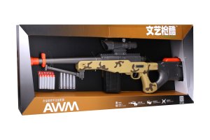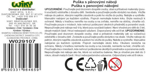 Puška odstřelovací na pěnové náboje set. Rozměry zbraně 87x5x22 cm. Obsah balení - puška, pás přes rameno, bezpečnostní brýle, zásobník na 5 nábojů, 12 pěnových nábojů. Pušku je možné rozložit na menší části (schéma k sestavení na obalu). Manuální nabíjení po každém výstřelu, střelba spouští.