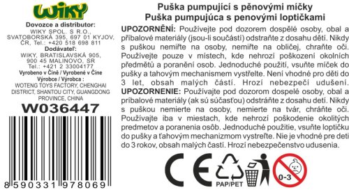 Puška pumpující s pěnovými míčky. Rozměry 23x6x14,5 cm.