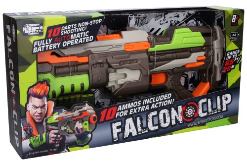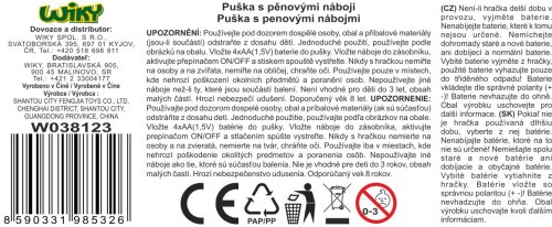 Puška s 10 pěnovými náboji. Rozměry 45x8,5x22 cm. 4xAA baterie součástí. Přepínač ON/OFF nad rukojetí. Dostřel až 20 m. Obrázkový návod s popisem na zadní části obalu.