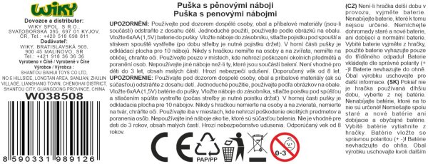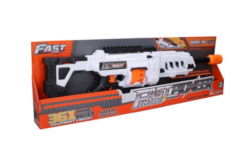 Puška s 36 pěnovými náboji. Rozměry 82x22x6 cm. 6xAA baterie nejsou součástí. Pojistka spouště pod spouští (pro střelbu nutno držet). Odkládací prostor pro 10 nábojů v horní části pušky.