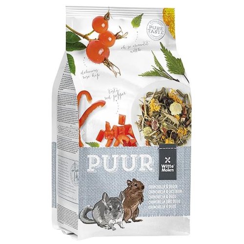 Witte Molen PUUR – skutečný požitek z ryzích přírodních chutí a vůní. Receptura PUUR chinchilla°u pro činčily a osmáky obsahuje vše, co tato zvířata potřebují pro plnohodnotný život. Vyvážené složení s vysokým podílem vlákniny pro dlouhodobé zdraví a optimální obrušování zubů, s přidanými vitamíny a stopovými prvky pro zvýšení vitality a prebiotiky pro podporu zdravého trávení. Receptura bez přidaných umělých cukrů, jako prevence narušení přirozené rovnováhy cukrů. Vysoký obsah vlákniny a nízká hladina škrobů pro citlivý trávicí systém činčil a osmáků. Bohatá směs s chutnými a různorodými přírodními surovinami pro vynikající apetit. Obsahuje 31 chutných surovin, včetně bojínku lučního, papriky, sušených šípků, kopřivy žahavky a květů měsíčku lékařského. Vyrobeno v Holandsku ve společnosti Witte Molen s tradicí od roku 1740. Složení: Vedlejší produkty rostlinného původu (4 % seno z bojínku lučního, 3 % měsíček, 0,2 % kopřiva), zelenina (1 % paprika) obiloviny, ovoce (4 % šípek), oleje a tuky, minerální látky. Analytické složky: Hrubý protein 13,6 %, hrubý tuk 2,4 %, hrubá vláknina 20 %, hrubý popel 6,1 %, vápník 0,54 %, fosfor 0,34 %, sodík 0,03 %. Doplňkové látky: Nutriční doplňkové látky (na 1 kg): vitamin A 9 250 IU, vitamin D3 920 IU, vitamin E 60 mg, vitamin C 600 mg, kyselina L-askorbová, (E1) železo 40 mg, (E4) měď 7,5 mg, (E5) mangan 15 mg, (E6) zinek 35 mg, (E8) selen 0,1 mg. Antioxidanty. Dávkování: Činčila nebo degu potřebuje asi 30 až 45 gramů potravy denně, v závislosti na životní fázi a zdravotní stav. Zajistěte neomezený přístup k senu a čerstvé vodě.