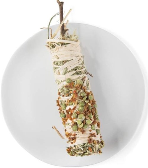 Witte Molen PUUR – skutečný požitek z ryzích přírodních chutí a vůní. PUUR pauze hay stick vegetable je lahodná tyčka ze sena, se zeleninou. 100% přírodní zábavný pamlsek pro býložravé drobné savce. Králíci, morčata, činčily a osmáci si nejen pochutnají na voňavém seně, sušeném hrášku a mrkvi, ale zároveň rozplétáním tyčky zaženou nudu. Pamlsek stimuluje přirozený hlodací instinkt a podporuje tak zdraví zubů. Navíc obsažená hrubá vláknina přispívá k správnému fungování trávení. Vyrobeno v Holandsku ve společnosti Witte Molen s tradicí od roku 1740. Složení: Vedlejší produkty rostlinného původu (86 % seno), zelenina (7 % mrkev, 7 % hrášek).