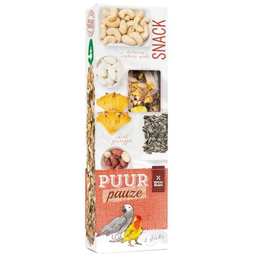 PUUR pauze Seed Sticks jsou velké lahodné tyčinky plné přírodních chutných složek pro skutečný gurmánský požitek. Křupavé tyčinky podnítí aktivitu ptáků, zabaví je a zaženou nudu. Bohatě vrstvené tyčinky s ananasem, arašídy, kešu, dýňovými a slunečnicovými semínky