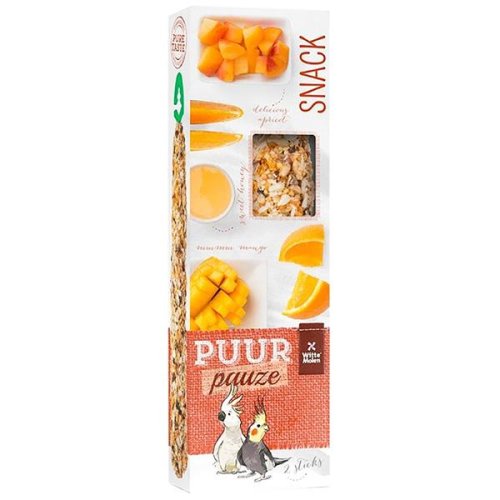 Witte Molen PUUR – skutečný požitek z ryzích přírodních chutí a vůní. PUUR pauze Sticks parakeet & cockatoo jsou lahodné tyčinky pro střední papoušky a papoušky kakadu plné přírodních chutných složek pro skutečný gurmánský požitek. Křupavé tyčinky podnítí aktivitu ptáků, zabaví je a zaženou nudu. Bohatě vrstvené tyčinky s mangem, meruňkami, pomeranči a medem. Vyrobeno v Holandsku ve společnosti Witte Molen s tradicí od roku 1740. Složení: Zrna, semínka, ovoce (4 % pomeranč, 2 % meruňka, 2 % mango), ořechy (2 % arašídy), cukr (2 % med).