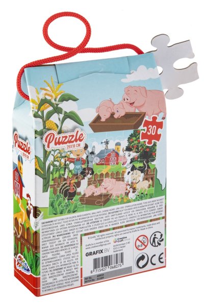 Nádherné dětské puzzle obsahující 30 velkých dílků, které po složení vytvoří obrázek s motivem farmy a domácích zvířátek o rozměru 29x18 cm, baleno v krásné dárkové krabičce s uchem