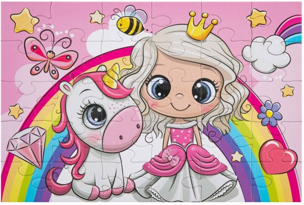 Nádherné dětské puzzle obsahující 30 velkých dílků, které po složení vytvoří obrázek s motivem princezny a jednorožce o rozměru 29x18 cm, baleno v krásné dárkové krabičce s uchem