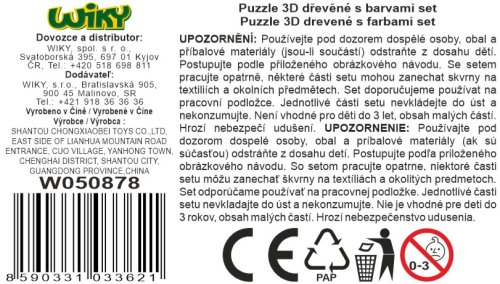 Puzzle 3D dřevěné domeček s barvami. Obsahuje 3D puzzle, barvy, štětec, obrázkový návod. Rozměry složeného domečku: 13,2x9,1x10,5