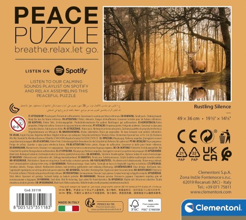 Skládání jako meditace. Uvolněte se, dýchejte, relaxujte... a skládejte. Řada Peace Puzzle od Clementoni nabízí dvojnásobný relax. Kombinuje totiž skládání puzzle a poslech hudby navozující pocit klidu a míru. Pečlivě vybrané obrázky překrásné přírody vyvedené v decentních barvách v kombinaci s příjemnou hudbou blahodárně působí na naše smysly. Puzzle obsahuje odkaz na originální playlist Spotify s relaxační hudbou a zvuky, vytvořený speciálně pro Clementoni Peace Puzzle. Rozměr složeného puzzle cca 49 x 36 cm