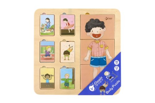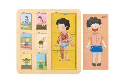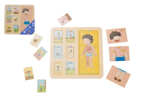 Puzzle lidské tělo má tři vrstvy. Zobrazuje strukturu těla ze svalů, orgánů a kostí. Děti mají možnost prozkoumat lidské tělo. Puzzle obsahuje 19 dřevěných dílů (včetně podložky). Rozměr podložky: 30 x 30 cm Vhodné pro děti od 12 měsíců