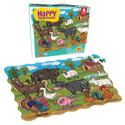 Puzzle šťastná farma nabízí dětem kreativní a chytrou zábavu. Z 208 velkých dílků si poskládají obrázek farmy včetně farmáře a jeho domácích zvířat. Přitom si budou rozvíjet fantazii, prostorovou představivost, trpělivost a jemnou motoriku. Skládačka je ideální pro děti od 4 let. Všechny části jsou z pevné lepenky. Poskládaný obrázek měří 64 x 90 cm.