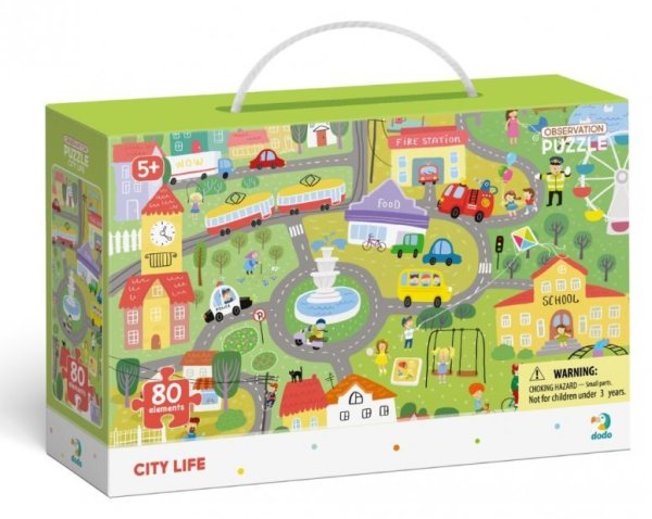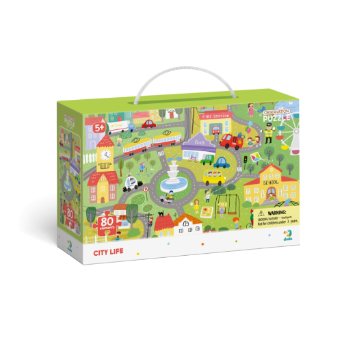 Poskládejte puzzle a najděte všechny budovy, dopravní prostředky..., které jsou vyobrazeny na obrázku. Barevný a detailně ilustrovaný obrázek s hledací hrou (možno hrát více způsoby: hledání na obrázku, ve více dětech kdo najde dřív, na čas..), rozvíjí slovní zásobu, paměť a koncentraci. Puzzle obsahuje 80 dílků Rozměr složenéno puzzle: 45 x 31 cm Rozměr krabičky: 25 x 16 x 6 cm Vhodné od 5 let