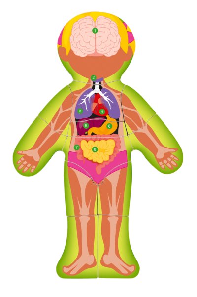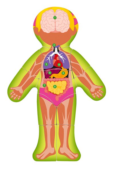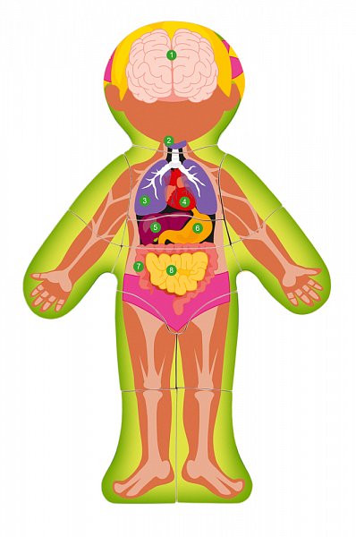 Anatomie lidského těla pro nejmenší. Po otočení lícové části puzzle (kůže), vidí dítě na rubu orgány a pod nimi kosti, které se na tomto místě skrývají. Vše je opatřeno popisky a základními názvy. Rozměr: 22,5 x 30 x 0,8 cm | Balení obsahuje 13ks | Věk: 3+