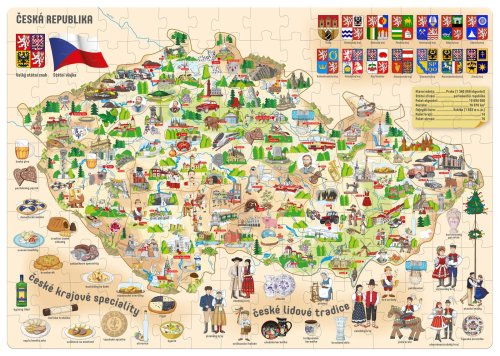 Milujete cestování a skládání puzzle? Pak je tato mapa České republiky přesně pro vás. Zeměpisné puzzle pro děti s mapou naší republiky a ilustracemi v podobě památek a turisty vyhledávaných míst. Puzzle vám pomohou naučit se jaké pamětihodnosti, stavby či přírodní útvary zde naleznou. Obrázky od českého výtvarníka. Počet dílků: 160 ks. Rozměr výrobku: 67,5x 47,5 cm. Rozměr balení: 31x22,5x7 cm. Věk: 3+