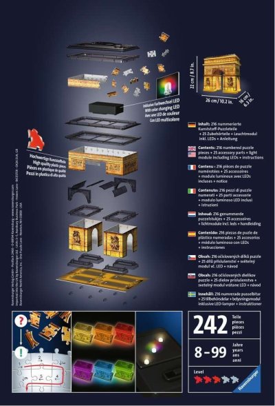 Noční edice slavného Vítězného oblouku! Stavba z výroby německé společnosti RAVENSBURGER se díky LED světlu ve tmě barevně rozzáří. Noční Vítězný oblouk je skvělým dárkem i nevšedním kouskem v 3D rozměru. Speciální ohebné dílky, které díky technologii EASYCLICK přesně zapadnou na své místo, umožňují postavit fascinující model dominanty Paříže. Dílky vyrobeny z pevného plastu zaručí vynikající stabilitu a celá stavba drží bez nutnosti lepení. Díky originálním doplňkovým dílkům budou vaši stavbu všichni obdivovat. Balení obsahuje :216 očíslovaných dílků puzzle, 25 dílů příslušenství, světelný modul včetně LED a návod. Baterie 3x AAA nejsou součástí výrobku. Vítězný oblouk v Paříži (celým francouzským názvem Arc de Triomphe de l'Étoile nebo jen Arc de Triomphe) je vítězný oblouk, který dal postavit Napoleon Bonaparte na paměť svého vítězství v bitvě u Slavkova. Více na Wikipedii Rozměr složeného puzzle cca 22x 26 x 16 cm