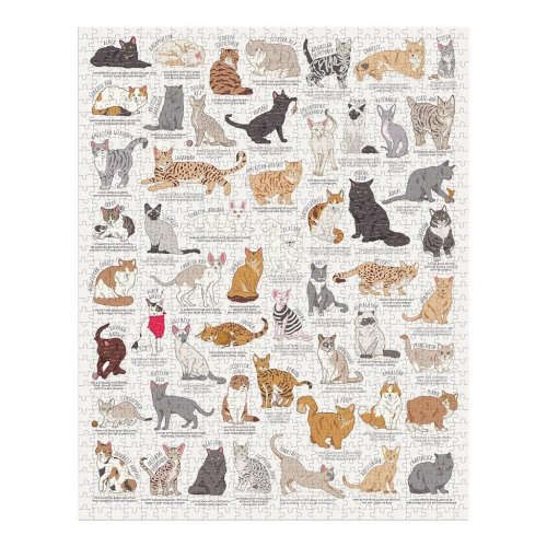 Užijte si hodiny zábavy s oblíbenými plemeny koček. Skládáním odhalíte na pět desítek různých, ručně ilustrovaných domácích koček a poznáte přitom i jejich typické vlastnosti. Ideální dárek pro každého milovníka těchto šelem! Po sestavení puzzle můžete zarámováním proměnit v obraz a pověsit na stěnu. Skládačka je spolu s návodným obrázkem balena v originálním kartónovém tubusu. Rozměry balení: 12 x 31 cm Rozměry puzzle: 70 x 55 cm Věk: 10+ Materiál: papír, karton