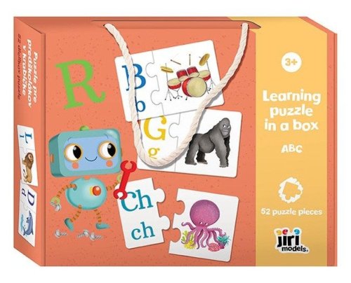 Krabička obsahuje 26 barevných puzzle kartiček s různými motivy, díky nimž se děti učí poznávat písmenka a ještě si jejich skládáním procvičují jemnou motoriku.