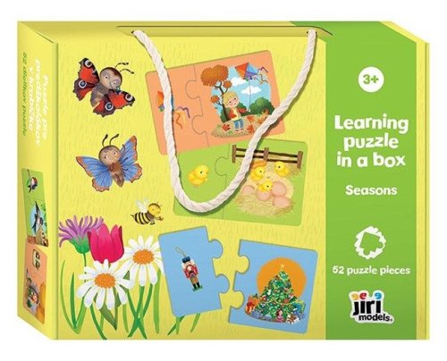 Krabička obsahuje 26 barevných puzzle kartiček s různými motivy, díky nimž se děti učí poznávat roční období a ještě si jejich skládáním procvičují jemnou motoriku.