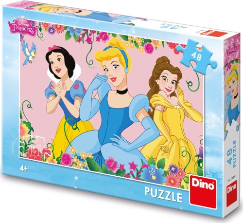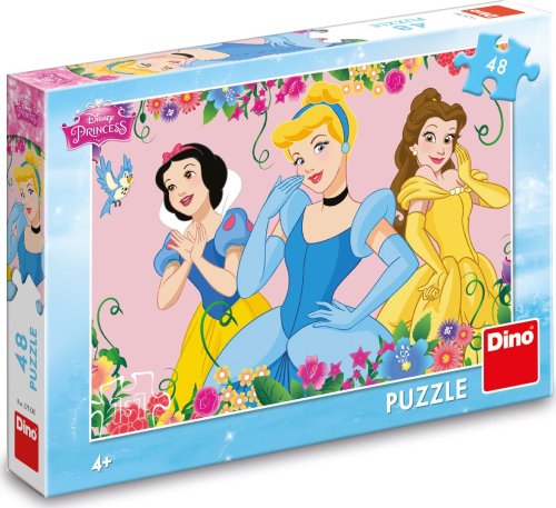 Dětské, 48-dílné, puzzle s princeznami Popelkou, Sněhurkou a Bellou. Doporučeno pro děti od 4 let. Rozměr složeného puzzle cca 26,4 x 18,1 cm