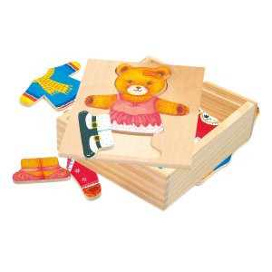 Medvědice Berta se těší, až jí obléknete podle svého vkusu. V dřevěné krabičce čeká spousta různých variant. 18 dílků, rozměry krabičky 13x4,3x14 cm