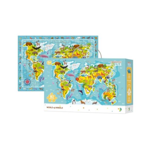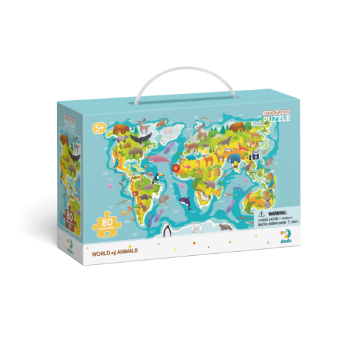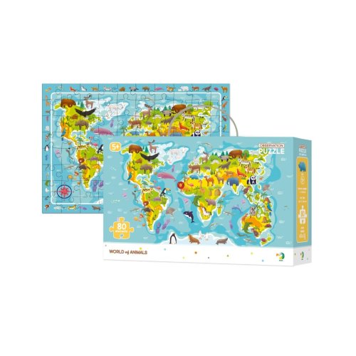 Vzdělávací puzzle, které obsahují barevné obrázky různých zvířátek, které žijí po celém světě. Po dokončení puzzlí mohou děti hrát hru „Najít a hledat“, kde určují umístění zvířat na mapě světa. Puzzle navržené tak, aby bylo zábavné i vzdělávací, s barevnými vzory, které napomáhají rozvoji dítěte. Velikost složeného obrázku: 45 x 31 cm Rozměr balení: 25 x 16 x 6,5 cm Vhodné pro děti od 5 let