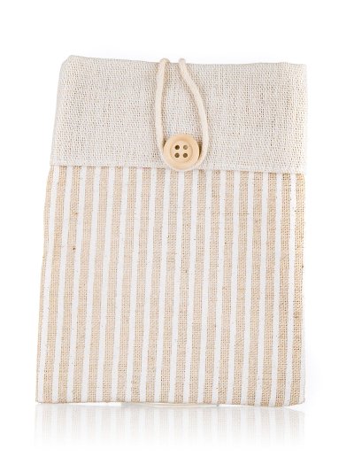 Přírodní dekorativní pytlík z bavlny světle hnědý s dekorem pruhy a zapínáním na knoflík, rozměr: 10,5 x 14 cm.
