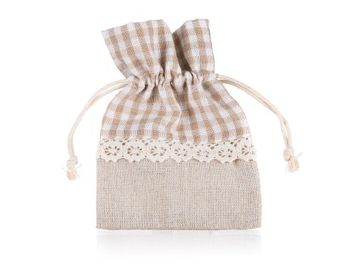 Přírodní dekorativní pytlík z bavlny s dekorem světle hnědobílá kostka, rozměr: 10 x 13 cm. Vhodný pouze pro dekoraci.
