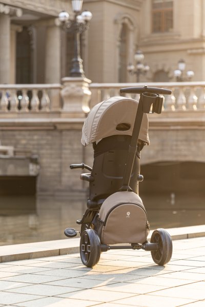 • Praktická odnímatelná taška – Na tříkolce je připevněna odnímatelná taška, která poskytuje dostatek místa na nákupy nebo dětské potřeby během procházek.