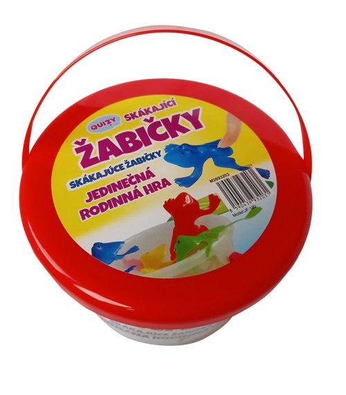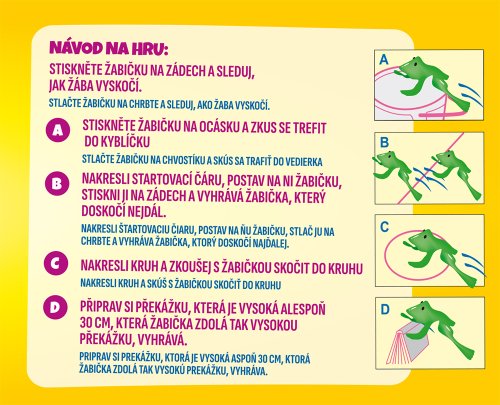 Sada žabiček, které se chtějí dostat do cíle. Skákající žabky jsou novou verzí známé hry blechy, která vyžaduje od hráčů obratnost, chytrost a zapojení, zároveň přináší spoustu zábavy! Ideální způsob, jak strávit volné odpoledne v rodinném kruhu a zasmát se do sytosti.