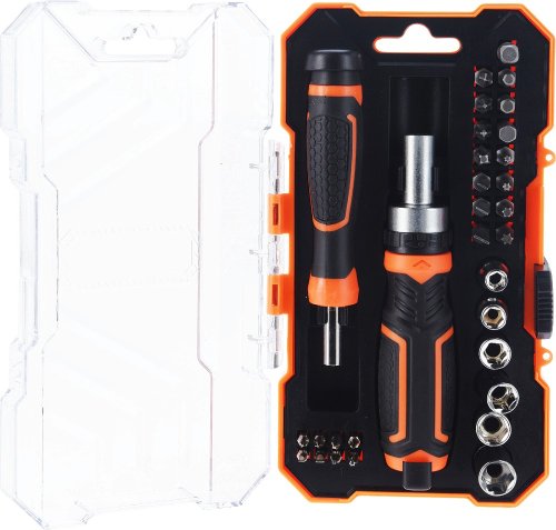Tato kvalitní sada obsahuje ráčnový šroubovák, mini šroubovák a širokou škálu bitů, ideální pro různé opravy a montážní práce. Je to skvélé vybavení pro domácí dílnu i profesionální použití.