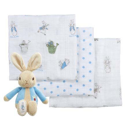 Krásná dárková sada s 3 ks mušelínových plenek a plyšovým zajíčkem Petrem. Plenky mají rozměr 60x60 cm a každá z nich má jiný potisk. Jsou 100% bavlněné a můžete je prát v pračce.