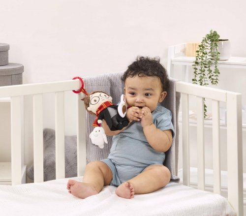 Plyšový kamarád s kousátkem a chrastítkem a pískající sovou! Je čas na kouzelná dobrodružství s Harrym Potterem! Tato zábavná závěsná hračka byla navržena tak, aby stimulovala smysly dítěte a podporovala hru v raném vývoji. Plyšový Harry Potter s kousátkem ve tvaru hvězdy má své typické kulaté brýle a jizvu po blesku, je oblečen do bradavické róby a na krku má barevný nebelvírský šátek. Harryho doprovází také jeho věrné koště Kulový blesk, které vydává jemný chrastivý zvuk, a jeho věrná společnice sova Hedvika, která při stisknutí píská. Hračku je snadné připevnit na kočárek, postýlku nebo autosedačku. Je proto ideální nejen na doma, ale i pro kouzelné chvíle na cestách. Je skvělým dárkem pro nejmladší čarodějnice a čaroděje. Hlavní vlastnosti:•hvězdné kousátko, chrastící koště Kulový blesk, pískající sova Hedvika, plyšový Harry Potter v dokonalém designu•vhodné od narození•skvělý dárek pro malé fanoušky kouzelného světa Harryho Pottera•napomáhá k rozvíjení smyslů•měkký plyš, kvalitní materiál•perfektní jako dárek•slouží k zavěšení na kočárek, postýlku nebo autosedačku