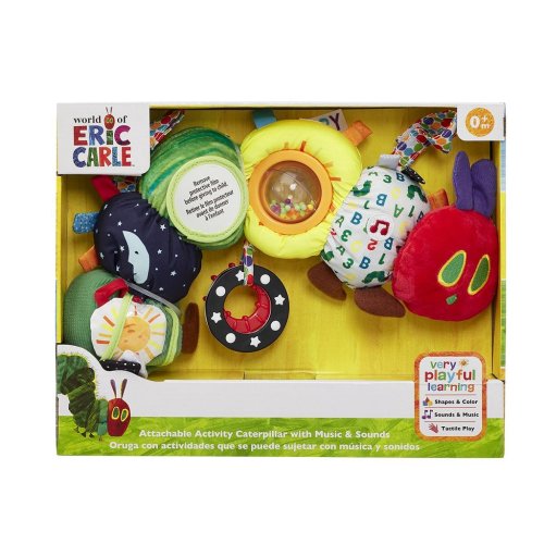 Nejslavnější postava pohádky "Very Hungry Caterpillar" od Erica Carlea jako zábavná hračka plná aktivit! Je navržena tak, aby stimulovala smysly dětí a podporovala jejich raný vývoj. Housenka se kroutí, chrastí nebo hraje ukolébavku „Třpyť se, třpyť se, hvězdičko“. Má různé textury, jenž mohou malé ručičky prozkoumat. Součástí je také připojitelný kroužek. Hlavní vlastnosti: veselá barevnostnapomáhá k rozvíjení smyslůtrénuje motorické dovednosti a soustředěnívhodné od narození