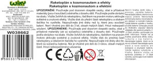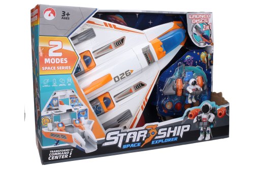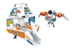 Raketoplán s kosmonautem a efekty. Velikost raketoplánu 55 cm, záchranného modulu 19 cm, kosmonauta 8 cm. Obsah - raketoplán, odpojitelná přední část jako záchranný modul, vznášedlo, kosmonaut. Záchranný modul vystřeluje disky po stisku oranžového tlačítka. Světelné a zvukové efekty tlačítkem na pravém motoru a při uzavření raketoplánu. 3xAAA baterie ze spodní části křídla součástí. Obrázkový návod na použití na spodní straně obalu.