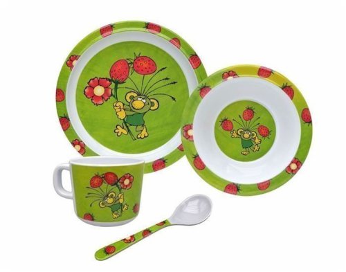 4-dílná dárková sada dětského nádobí. Sada obsahuje talířek pr.21cm, misku pr.16cm, hrneček s jedním uchem v.6,5cm a lžičku d.14cm. Materiál 100% melamin bez ftalátů. Možno mýt v myčce. Tisk v mezivrstvě. Doporučený věk: od 6 měsíců