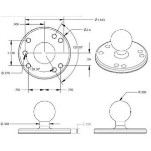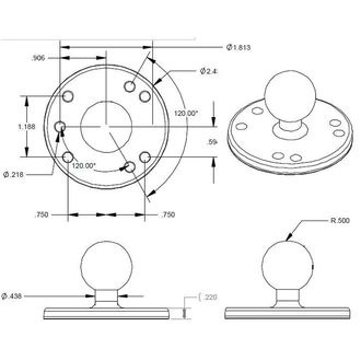 RAM-B-202U kruhový adaptér / úchyt na rovné povrchy s 1" čepem. Adaptér má průměr 6,35 cm a má předvrtaných 7 děr, z toho 4 dle průmyslového vzoru děr AMPS.