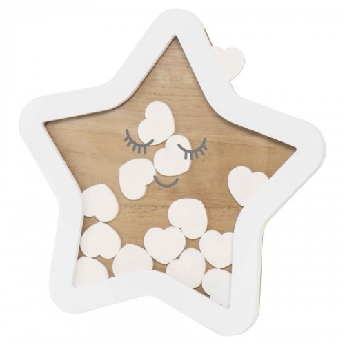 balení obsahuje 1 velkou hvězdu (25x25x1,2cm) a 25 bílých popisovatelných srdíček (3,5cm x 2,5cmx0,2cm)