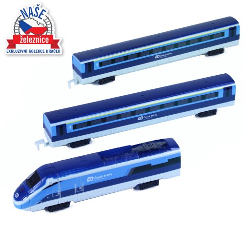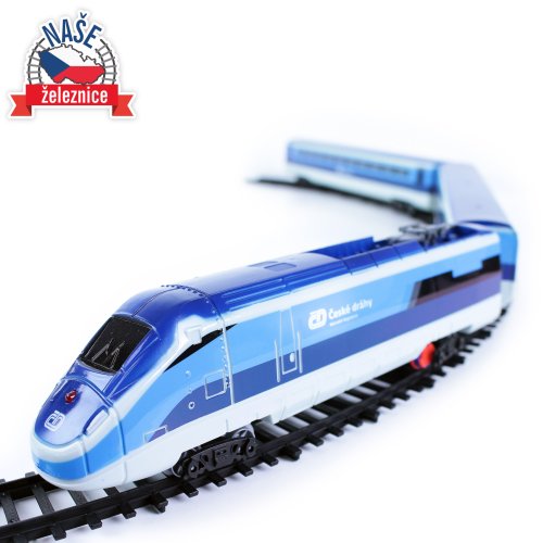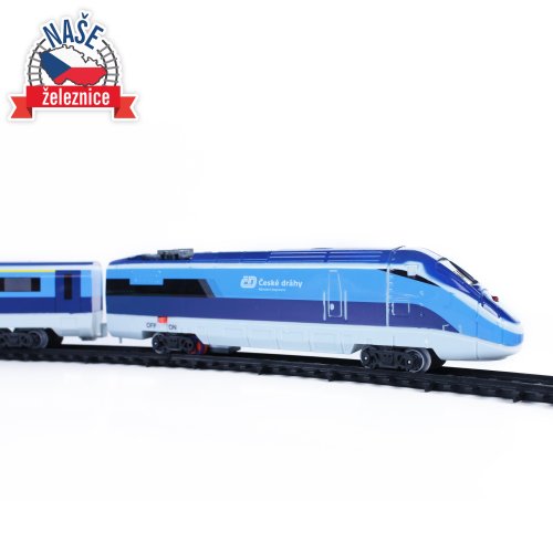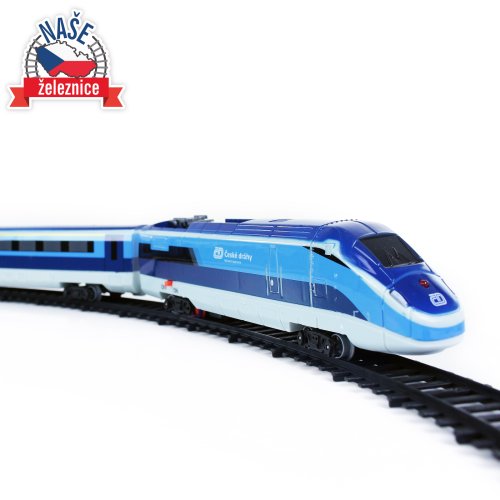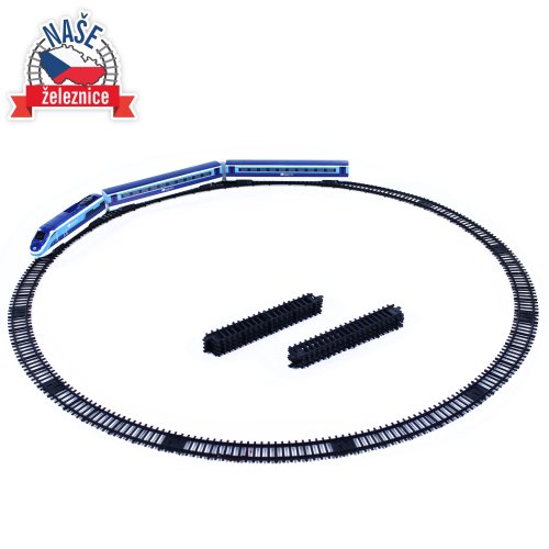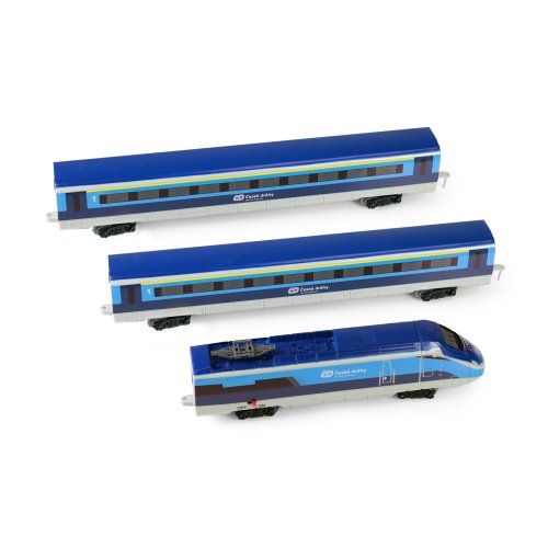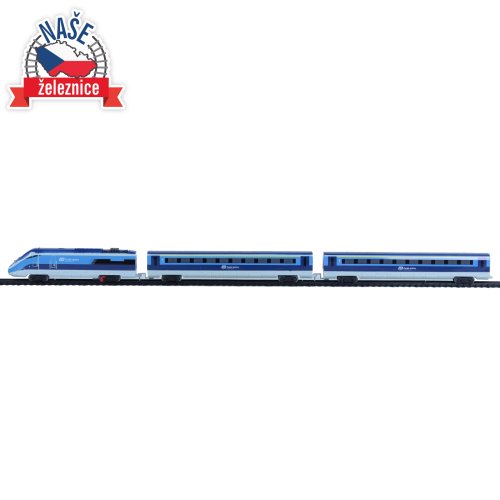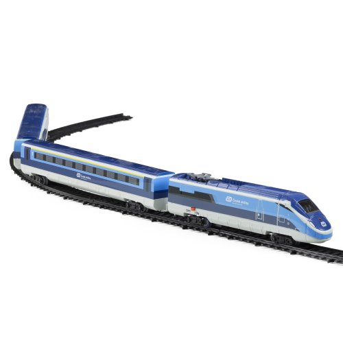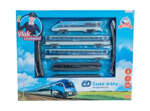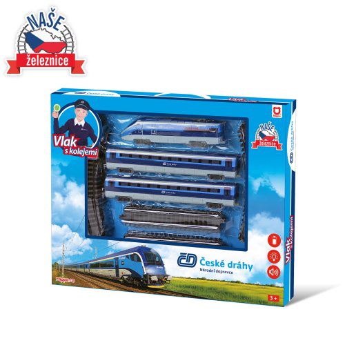 Sada s originálním vlakem od Českých drah obsahuje lokomotivu se dvěma vagóny i vláčkodráhu skládající se z 12ti zahnutých a 8mi rovných kolejí. Vlak vydává zvuk a svítí. Vhodné od 3 let.