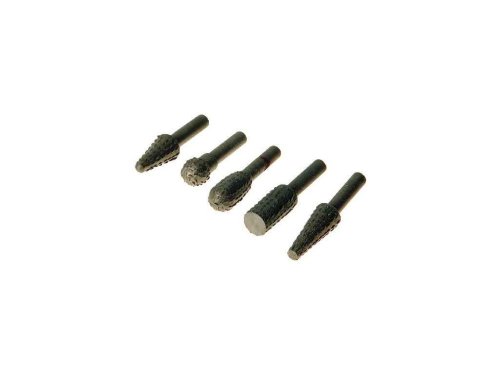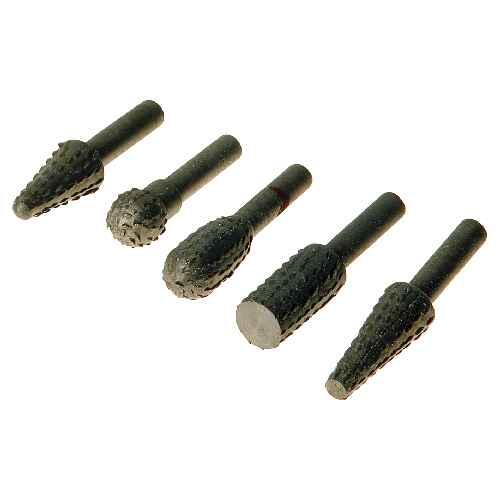 Rotační rašple sada 5kusů, stopka 6 mm pro úchyt ve vrtačce nebo aku vrtačce. Pro hrubší obrušování a broušení dřeva, dřevotřísky, překližky. EAN 8590804020851