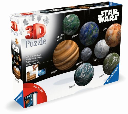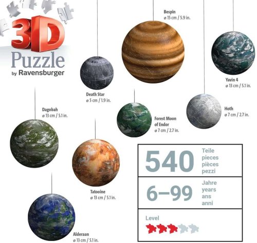 "Původní trilogie Star Wars ožije u vás doma! Sestavte si vlastní soustavu 8 nejvýraznějších planet z Galaxie Star Wars z kvalitních plastových 3D Puzzle dílků. Realistické modely planet Hvězda smrti, Endor, Hoth, Yavin 4, Tatooine, Alderaan, Dagobah a Bespin si snadno uspořádáte a vystavíte díky praktickým stojánkům a podkladu pro sestavení Galaxie Star Wars. Planety můžete také zavěsit ze stropu pomocí přiložené nylonové šňůry. Puzzle dílky do sebe přesně zapadají a drží pohromadě bez lepení díky patentované EasyClick technologii. "