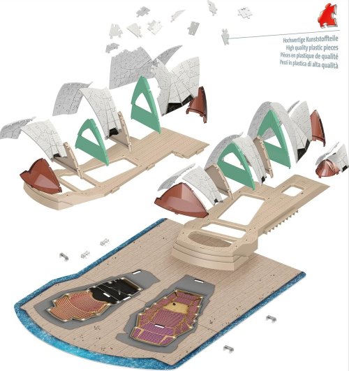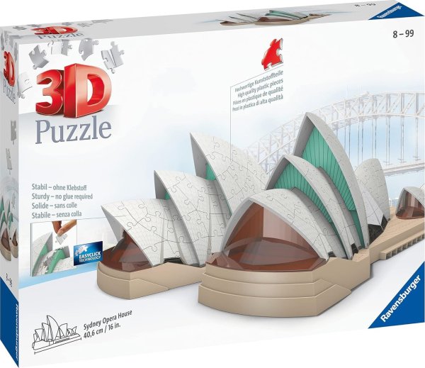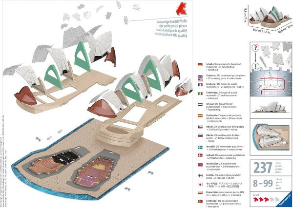 Doména Sydney, nyní jako 3D model od výrobce Ravensburger! Postavte si zmenšenou verzi australského architektonického skvostu. Speciální zakřivené nebo ohebné dílky, které přesně zapadnou na své místo, umožňují postavit fascinující modely slavných budov. Dílky vyrobeny z pevného plastu zaručí vynikající stabilitu, a celá stavba drží bez nutnosti lepení. Díky originálním doplňkovým dílkům budou vaši stavbu všichni obdivovat. Obtížnost: 3,5. Balení obsahuje: 216 očíslovaných dílků puzzle + 21 dílů příslušenství + návod. Opera v Sydney je stavba navržená v roce 1956 dánským architektem Jørn Utzonem. Nachází se v australském městě Sydney. Původní rozpočet 7 milionů australských dolarů byl mnohonásobně překročen, náklady se vyšplhaly až na 102 miliónů. Stavba byla dokončena v roce 1973. V roce 2007 zapsalo UNESCO Operu v Sydney na seznam Světového kulturního dědictví. Jedná se o první stavbu zapsanou na tento seznam ještě za autorova života. Rozměr složeného puzzle cca 40,6 x 29,2 x 12,8 cm