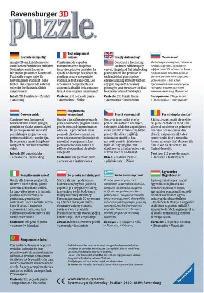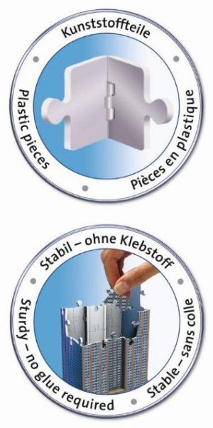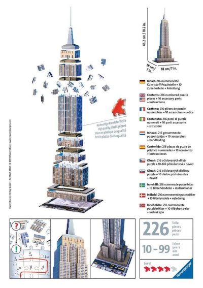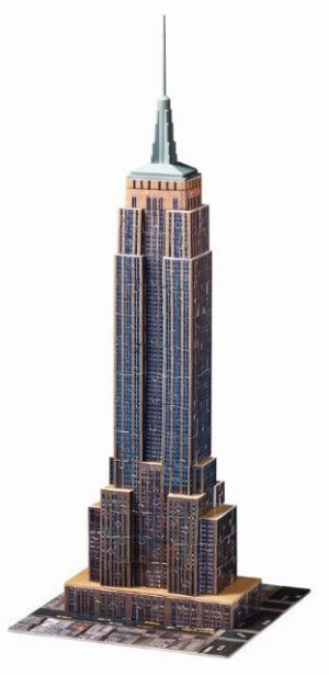 Po úspěchu s koulí Puzzleball a pyramidou Puzzlepyramid se RAVENSBURGER pustil do další výzvy - a tou jsou stavby. Speciální zakřivené nebo ohebné dílky, které přesně zapadnou na své místo, umožňují postavit fascinující modely slavných budov. Dílky vyrobeny z pevného plastu zaručí vynikající stabilitu, a celá stavba drží bez nutnosti lepení. Díky originálním doplňkovým dílkům budou vaši stavbu všichni obdivovat. Balení obsahuje: 216 očíslovaných dílků puzzle,10 dílů příslušenství a návod. Empire State Building je 102patrová budova postavená ve stylu art deco, nacházející se v New Yorku v USA na křižovatce Páté Avenue a West 34th Street. Po jejím dokončení v roce 1931 se stala na více než 40 let nejvyšší budovou světa, v roce 1972 ji překonala severní věž Světového obchodního centra. Po zřícení budov při teroristických útocích 11. září 2001 se Empire State Building stala nejvyšší budovou New Yorku a třetí nejvyšší v USA. V roce 1986 se budova zařadila na seznam národních kulturních památek. Budova je neodmyslitelnou součástí města, podobně jako Eiffelova věž patří k Paříži. Více na Wikipedii Rozměr složeného puzzle cca 46,2 x 18 x 18 cm