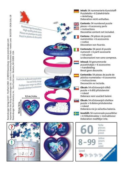 Uzavíratelná dekorativní šperkovnice ve tvaru srdíčka s mořskou pannou. Speciální zakřivené nebo ohebné dílky, které přesně zapadnou na své místo, umožňují postavit designovou šperkovnici, která působí velmi reálně. Dílky jsou vyrobeny z pevného plastu a zaručí vynikající stabilitu. Srdce drží bez nutnosti lepení. Balení obsahuje: 54 očíslovaných dílků, 6 ks příslušenství a návod. Obsah krabičky vyobrazený na fotografii není součástí balení. Rozměr složeného puzzle cca 11,2 x 10,3 cm