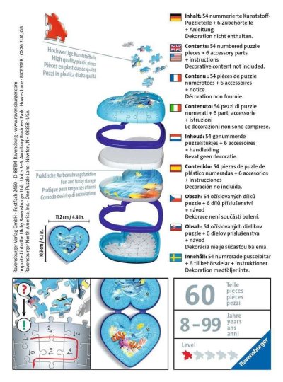Uzavíratelná dekorativní šperkovnice ve tvaru srdíčka s motivem podmořského života se stane skvělým dárkem pro každou příležitost. Speciální zakřivené nebo ohebné dílky, které přesně zapadnou na své místo, umožňují postavit designovou šperkovnici, která působí velmi reálně. Dílky jsou vyrobeny z pevného plastu a zaručí vynikající stabilitu. Srdce drží bez nutnosti lepení. Balení obsahuje: 54 očíslovaných dílků puzzle, 6 dílů příslušenství a návod. Obsah krabičky vyobrazený na fotografii není součástí balení. Rozměr složeného puzzle cca 11,2 x 10,3 cm