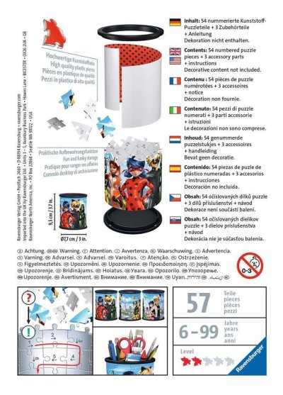 Tužky už se nebudou válet po stole a navíc bude krásný dárek vždycky na očích! Další z řady praktických předmětů ve formě 3D puzzle od výrobce RAVENSBURGER se stane skvělým dárkem pro každou příležitost. A nemusí sloužit pouze jako tužkovník, ale třeba jako stojánek na dekorativní kosmetiku a jiné věci. Speciální zakřivené dílky, které přesně zapadnou na své místo, vytvoří kouzelný stojánek nejen na psací potřeby, ale na cokoliv, co děti potřebují . Dílky jsou vyrobeny z pevného plastu a zaručí vynikající stabilitu bez nutnosti lepení. 3D puzzle RAVENSBURGER lze skládat podle motivu (obtížnější varianta) nebo podle praktického číslování na zadní straně dílků. Stojan má po sestavení výšku přibližně 9,5 cm o průměru 7,7 cm. Balení obsahuje: